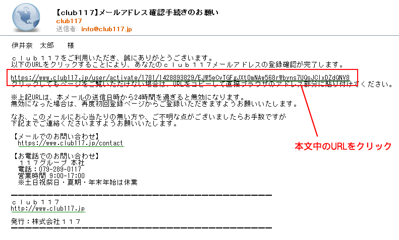 STEP4でご入力いただいたメールアドレスに、club117から「メールアドレス確認手続きのお願い」メールが届きますので、有効期限内にメール本文に記載されているURLをクリックして登録を完了してください。