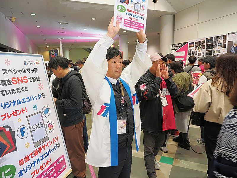 今季2度目の117グループスペシャルマッチ!この日も特別企画として、SNS写真投稿キャンペーンが行われました。スペシャルマッチでの写真をSNSに投稿すると、117オリジナルエコバッグをプレゼント。抽選で選手サイン入りエコバッグが当たるチャンスもあり、117グループブースの前には長蛇の列ができるほどの人気ぶり!