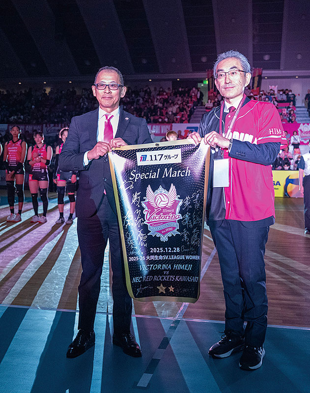 2025年最後のリーグ戦が12月28日(日)にヴィクトリーナ・ウインク体育館で開催されました。対戦相手は今季、首位を独走状態のNECレッドロケッツ川崎。前売りチケット完売の3,293名(過去最高動員)の観客の中、117グループスペシャルマッチが始まります!