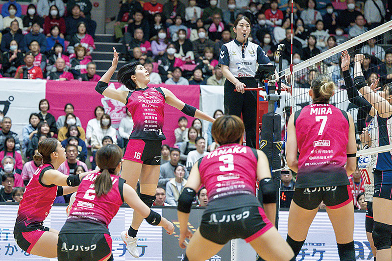 試合で左手を負傷し欠場していた姫路の主砲、ミンガルディ選手の復帰戦。立ち上がりからミンガルディ選手の力強いスパイクが決まり、野中選手や#11宮部藍梨選手も絡んだバランスの良い攻撃でリズムをつかみます。